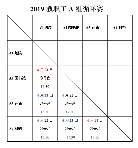 本次比赛第一阶段为小组循环赛(青岛校区共分4个小组,上次学校比赛前4名为A1,B1,C1,D1种子队),第二阶段A、D,B、C 组交叉淘汰赛(每小组前两名)。