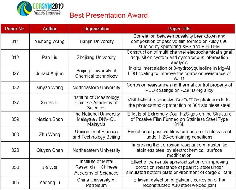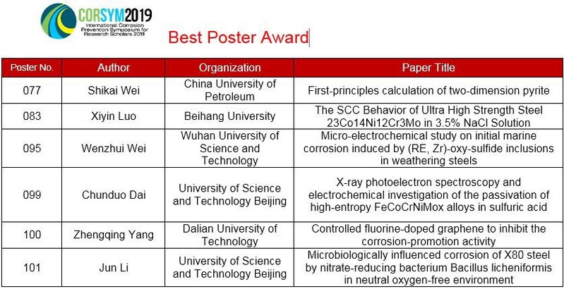 本次会议涵盖工业环境腐蚀、环境敏感断裂、微生物腐蚀、电化学测试、先进耐蚀材料、轻合金、先进涂层、现代阴极保护、缓蚀剂等多个议题,包含近70余篇分会场报告和30余篇墙报,全程英文展现,体现了腐蚀青年学者和研究生的国际化水平。本次会议设立了最佳墙报奖和最佳口头报告奖,并颁发奖金。在各墙报评委和各会场主席及报告评委认真打分评判的基础上,CORSYM 2019评奖委员会根据分数高低分别选取了6篇最佳墙报奖和10篇最佳口头报告奖,并邀请分会场主席和国内外专家为获奖人颁奖。