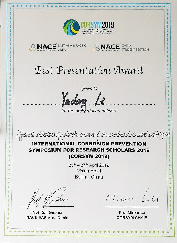 威廉希尔足球官方网站李焰教授课题组博士生李亚东所做的题为“Efficient detection of galvanic corrosion of the reconstructed X80 steel welded joint”的报告,受到业内专家的高度关注,经大会执委会评选,获评“最佳口头报告奖”。