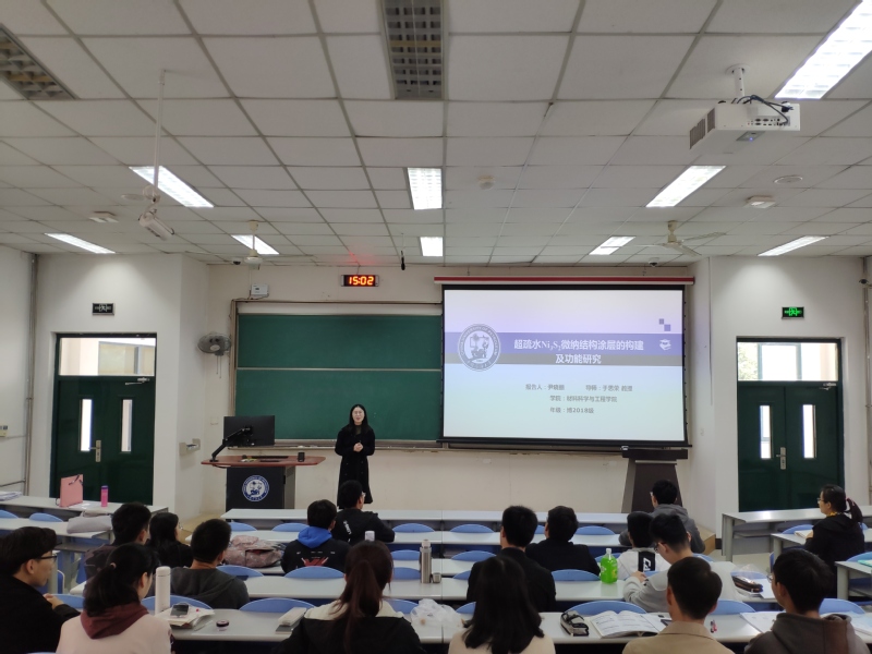 活动伊始,尹晓丽以《超疏水Ni3S2微纳结构涂层的构建及功能研究》为题,从研究背景、研究进展、发展前景三方面分别做了详细介绍,分享了她两年多来的科研之路与科研经验。在她耐心的讲述中,与会成员不仅学习到了相关研究方向的专业知识,也切实体会到了一名优秀博士研究生的风采。最后,尹晓丽针对同学们提出的“低年级员工如何做准备”、“硕博连读员工在科研中如何处理问题”等做出了详细的解答。活动结束后,材料研1902班房璐说道:“机会总是留给有准备的人,在日后的科研学习中,我要以师姐为榜样,努力拼搏、潜心科研,向榜样看齐!”