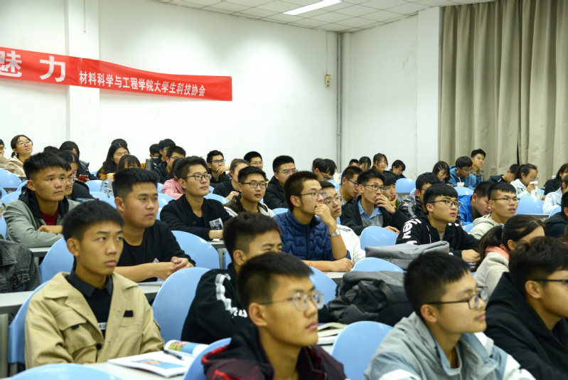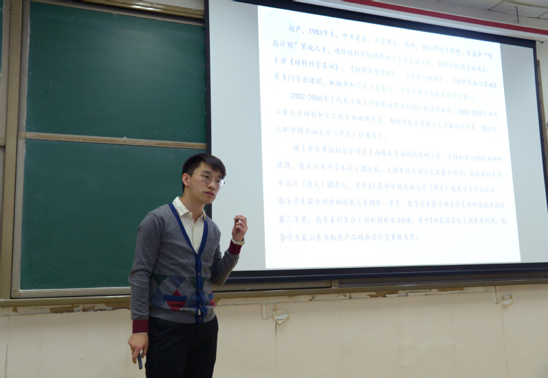 讲座伊始,赵严老师分享歌曲《老男孩》,并简谈自己多年求学经验,每次听到歌曲都会动容,勉励同学们珍惜时间,把握大好年华,施展人生抱负。“能源、材料、信息是现代三大科技支柱”,“天地万物,凡能为我所用者,皆谓之为材料”赵严老师引经据典,同时又结合实际例子为大家介绍材料的热点领域,分享各材料强校特色,鼓励大家积极上进,继续深造,为我国材料领域的发展贡献自己的一份力量。赵严老师还着重强调,学校学院立足实际情况,鼓励大家到更高的学府去求学,更欢迎大家留校,继续为石油大学、为材料学院的发展做出贡献。