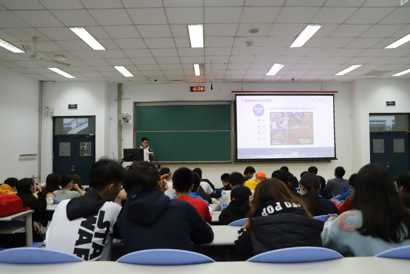 随后,全体成员于西廊202教室参加团日活动第二部分:海洋生态宣讲。本次宣讲邀请到“蓝丝带”社团成员。其以较为专业的知识从海洋污染物来源、海洋环境的自净能力以及污染物的危害三个方面为与会成员讲解海洋生态,以增强参与员工的环保意识。宣讲人表示,海洋具有一定的自净能力,可将污染物进行分解,但当污染物数量超过自净能力,将会造成严重的海洋污染。同时,他还指出当今世界上海洋污染的主要来源,如游轮泄露、工业废水、过度捕捞等,这些行为不仅造成海洋环境污染,也对其生态环境造成破坏。财务1801刘迪接受采访时说到:“这次海洋生态定向越野和海洋生态宣讲让我懂得了增强体质以及环保的重要性。”