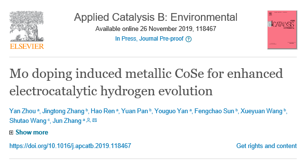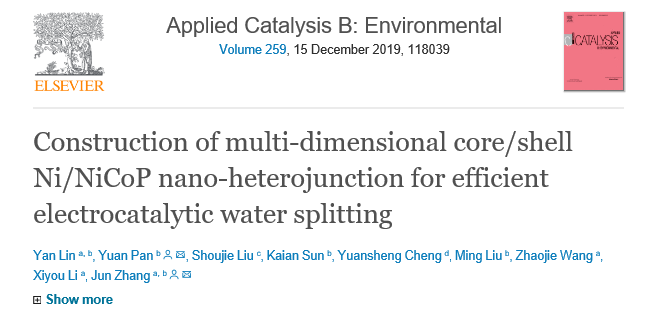 研究论文《用于高效电催化水裂解的多维核/壳Ni/NiCoP纳米异质结的构建》(Construction of multi-dimensional core/shell Ni/NiCoP nano-heterojunction for efficient electrocatalytic water splitting)和《Mo掺杂诱导金属性CoSe用于高效电催化析氢》(Mo doping induced metallic CoSe for enhanced electrocatalytic hydrogen evolution)以威廉希尔体育登录入口为第一署名单位先后发表在Applied Catalysis B: Environmental杂志上。