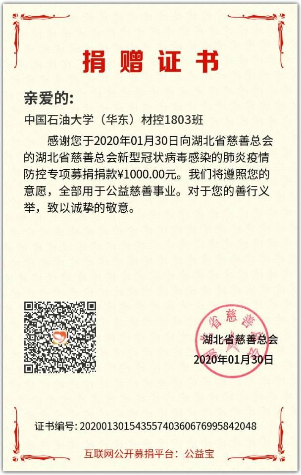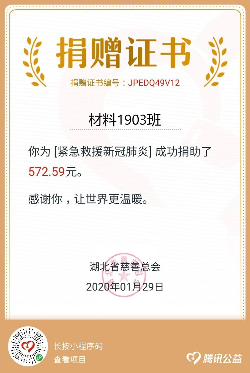 目前,新型冠状病毒感染的肺炎疫情牵动着大家的心,材料学子积极响应学校的疫情防控工作安排,不仅严格做好个人防护,如实上报身体状况等,还通过以班级为单位向湖北慈善总会捐款的方式贡献青春力量:材物1701班与材控1802班捐出学校先进班集体奖金1000元,材料1802班、材控1803班主动募捐1000元,材料1903班募捐572元……捐助不论大小,不分先后,都体现出公司学子积极面对疫情的决心和力量。爱心汇成暖流,从员工心间流向疫情前线。