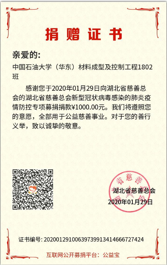“一方有难八方支援,班级同学有责任担当,献出微薄之力来支持这场斗争,同心协力抗击疫情,战胜病魔,共度难关。”材控1803班团支书王俊杰如是说。