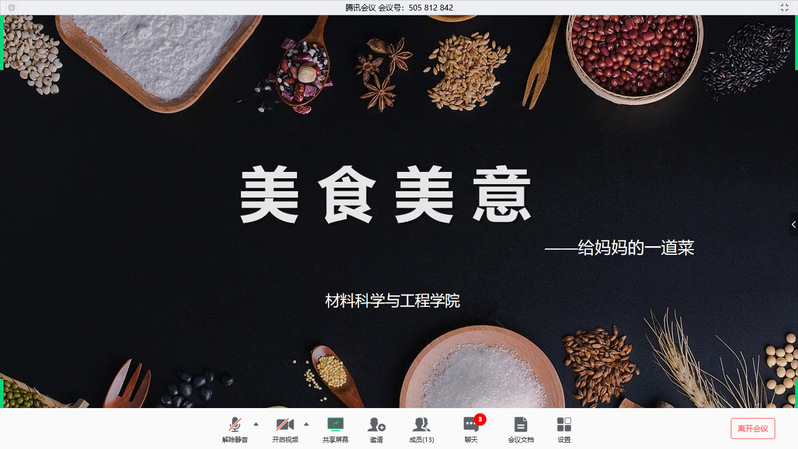 疫情期间为激发员工生活热情,鼓励其为家庭尽孝心、为社会尽爱心,材料学院研究生会特举办思美节系列活动“美食美意——给妈妈的一道菜”线上厨艺比赛,并于3月26日晚进行决赛。
