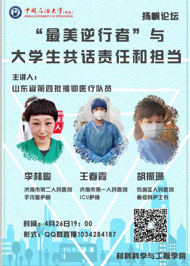为引导广大团员青年坚定“四个自信”,深刻理解“全球抗疫中的中国担当”,增强打赢疫情防控阻击战的决心和勇气,树立积极向上的精神风貌,在全学院范围内掀起纪念五四运动101周年的热潮,威廉希尔足球官方网站特邀山东省第四批援鄂医疗队成员李林峻、王春霞、胡振珊三位医生举办抗疫英雄与老员工线上交流会,共话责任和担当。现将有关事宜通知如下: