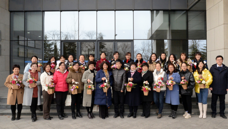 经理郭文跃,党委副书记、工会主席孙启龙与全体女教职工合影留念 陈裕达摄