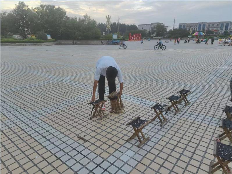 实践队员为居民摆放看电影的椅子 杨育宁摄
