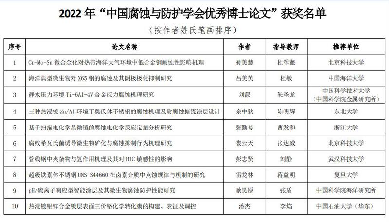 据悉,“中国腐蚀与防护学会优秀博士论文奖”于今年首次设立,旨在推动中国腐蚀与防护领域的科技进步,鼓励创新性研究,激励腐蚀与防护领域的博士研究生潜心钻研,表彰做出优秀成果的年轻学者。