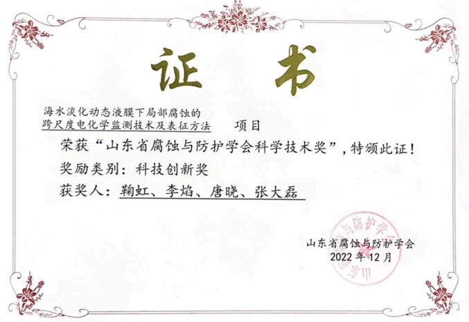 近日,山东省腐蚀与防护学会公布了2022年度山东省腐蚀与防护学会科学技术奖的评选结果,公司鞠虹副教授牵头申报的“海水淡化动态液膜下局部腐蚀的跨尺度电化学监测技术及表征方法”项目荣获科技创新奖。
