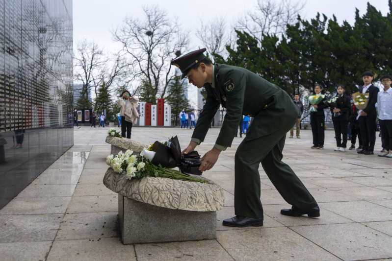 员工代表、退伍老员工士兵孙晓烨向革命烈士献花 魏欣悦摄影