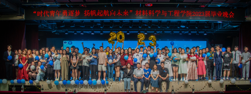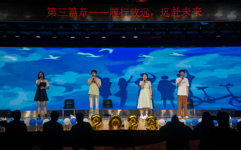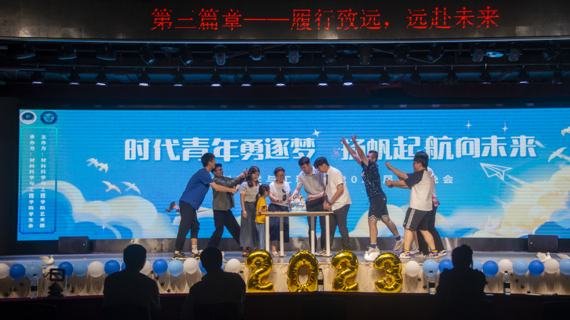 晚会的最终环节,由学校员工心理健康中心辛晓雯、毕业班班主任甄玉花、2019级本科生辅导员褚奇以及2023届毕业生代表高赟共同切开毕业蛋糕,祝福毕业生此去前程似锦,鹏程万里。伴随着歌曲《起风了》的悠扬婉转的旋律,毕业生共同观看了《材料学院2023届毕业生回忆录》视频,在细细回忆着大学四年真挚的师生情谊中晚会落下帷幕。