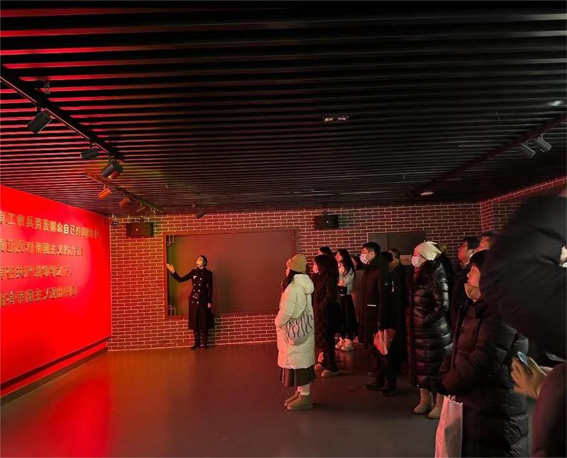 1月27日上午,实践队成员来到了九一八历史纪念馆,走进博物馆的序厅,白色浮雕和黑色大理石地面相映,营造出白山黑水的壮美景象,中间一铜卧碑碑顶长明不熄的火焰象征着东北人民不屈的斗争精神长存。随着人流,实践队员走过“外攘门”,通过讲解员的讲解,实践队员了解到,外攘门是当时民众出沈阳城逃难的主要路径,所以在展厅中复制了外攘门,门高十四米,象征着中国十四年抗战史。