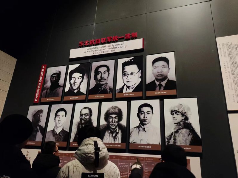 纪念馆的第二、三部分陈列了从张作霖与日、俄周旋,到张学良执掌奉系军阀,再到东北沦陷,摧残人民意志,细菌实验等。第四、五部分着重陈列展示了东北人民的抗战经过,展墙上,悬挂着杨靖宇、赵一曼、赵尚志等十位抗日英雄的照片。实践队员在各位英雄的照片前默哀,向他们所代表的千千万万抗日将士致敬。展馆中还陈列了东北抗联战士们穿过的大衣、风衣、靰鞡鞋和使用过的武器等,与旁边展柜里日寇的装备形成了鲜明对比。通过实物对比,实践队员充分感受到了东北抗日联军的艰苦斗志和不屈不挠的精神。