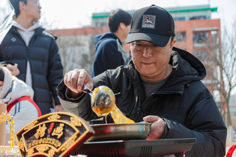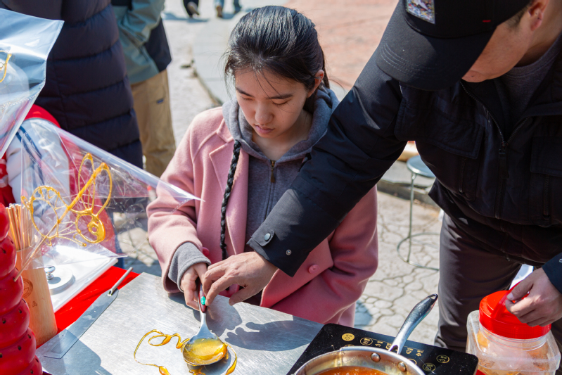 3月10日,学院员工会在荟萃广场举行“邂逅非遗,巧手匠心”思美节游园活动,活动邀请到非遗糖画的传承人林燕军老师,带领同学们走进美好的糖画时光,品味传统韵味,感受非遗之美。以勺为笔,以糖为墨,在老师精湛的手艺下,玫瑰、蝴蝶、爱心、小兔子……一幅幅活灵活现的作品烘托出节日的气氛。“以前只在电视上看到过糖画制作,这是第一次近距离感受和体验,我也充分感受到了非物质文化遗产的独特魅力。”学院2021级本研一体化班(材料类)员工杨裕在老师的指导下体验了糖画制作。