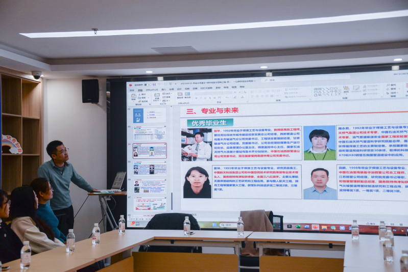 “老师,材控专业就是学习电焊吗?”面对员工对于材料成型及控制工程专业的认知偏差,李学达深入介绍了材控专业的内涵,并以“大国重器”“大国工匠”等为例,生动地介绍了材控专业在国家核心领域的应用与需求;“服务油气运输的管道焊接技术专家”“参与载人航天工程的工艺研究员”“潜心人才培养和科学研究的大学教授”……面对员工普遍关心的材控专业就业方向问题,两位老师以众多优秀毕业生为例,展示了材控专业带来的无限可能。随后,在场师生围绕“新能源材料领域与传统材料领域的比较”展开讨论,李学达为员工详细分析了各领域的利与弊,并建议员工要结合自身的兴趣与特点进行专业选择。最后,李立英老师对员工们提出三点期望,一是要学好大一课程,为后期的专业学习打下坚实的基础;二是要锻炼自学能力,这是长远发展的关键;三是要提升综合能力,学习是基础但不是唯一,综合素质才是核心竞争力。
