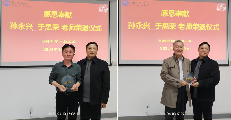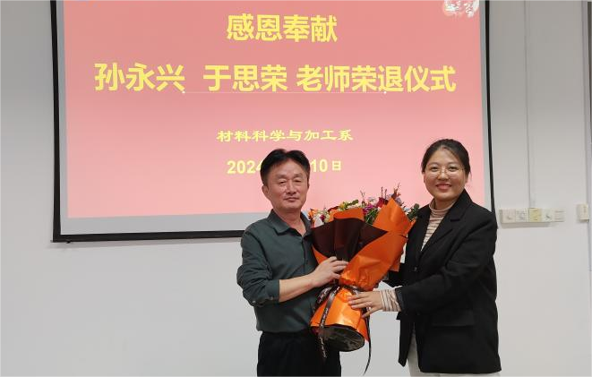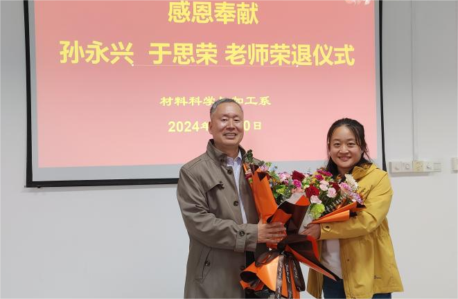4月10日上午,学院在工科E510隆重为孙永兴和于思荣两位教授举行荣退欢送会,材料科学与加工系全体教师参加,威廉希尔足球官方网站党委书记门小刚受邀参加。