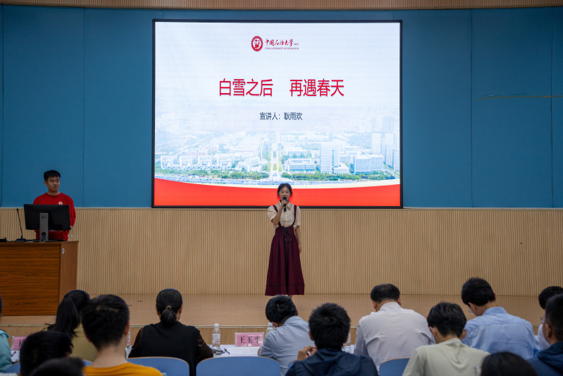 比赛过程中,各位选手感情真挚、各具特色,为观众们呈现出一个个生动的校史故事,带领大家领略峥嵘厚重的历史岁月,感受不同时代奋斗者们对石大精神的诠释。彭茜、曲琳婷以小组的形式展现了诗朗诵《石大的青春》,创新的语体风格让大家眼前一亮,她们分别饰演了建校初期和建校70周年的19岁石大学子,通过跨越时空的对话,展现了一代代石大人“青春献给祖国”的共同心声。耿雨欢以《白雪之后,再遇春天》为题,讲述了华东石油学院时期,李健鹰教授将荒芜的盐碱地转化为生机勃勃的校园,用智慧和汗水书写了中国石油教育辉煌篇章的故事,歌颂了石大人不畏艰难、勇于探索的精神。