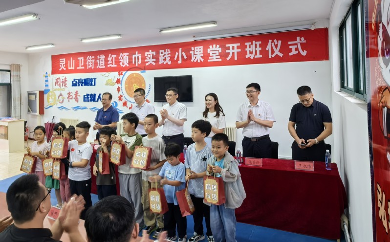仪式伊始,周兆燕代表灵山卫街道以及镇海门社区对公司师生的到访表示热烈欢迎和衷心感谢,并对所开展的红领巾实践课堂给予高度肯定。马国刚代表学校向与会人员,对红领巾课堂课程体系进行了详细介绍,并对课堂品牌建设提出了殷切期望,期望红领巾课堂为和谐社区建设贡献力量。赵雅宁代表实践课堂授课教师志愿者进行发言,用心、用情了解每一位孩子的独特需求与梦想,加强培训,提升教学质量,为员工的暑期学习成长保驾护航。随后,各位领导向员工发放学习用品。
